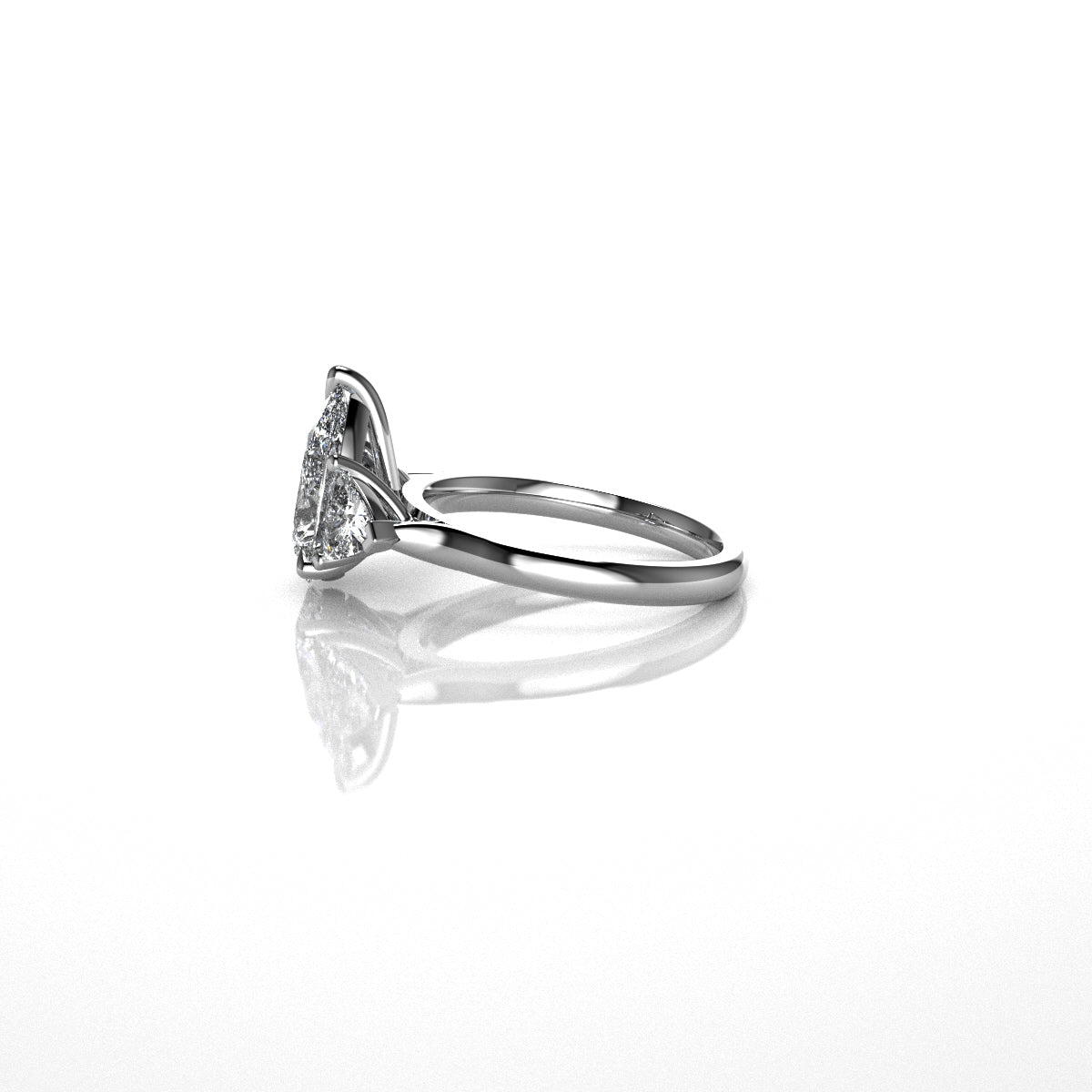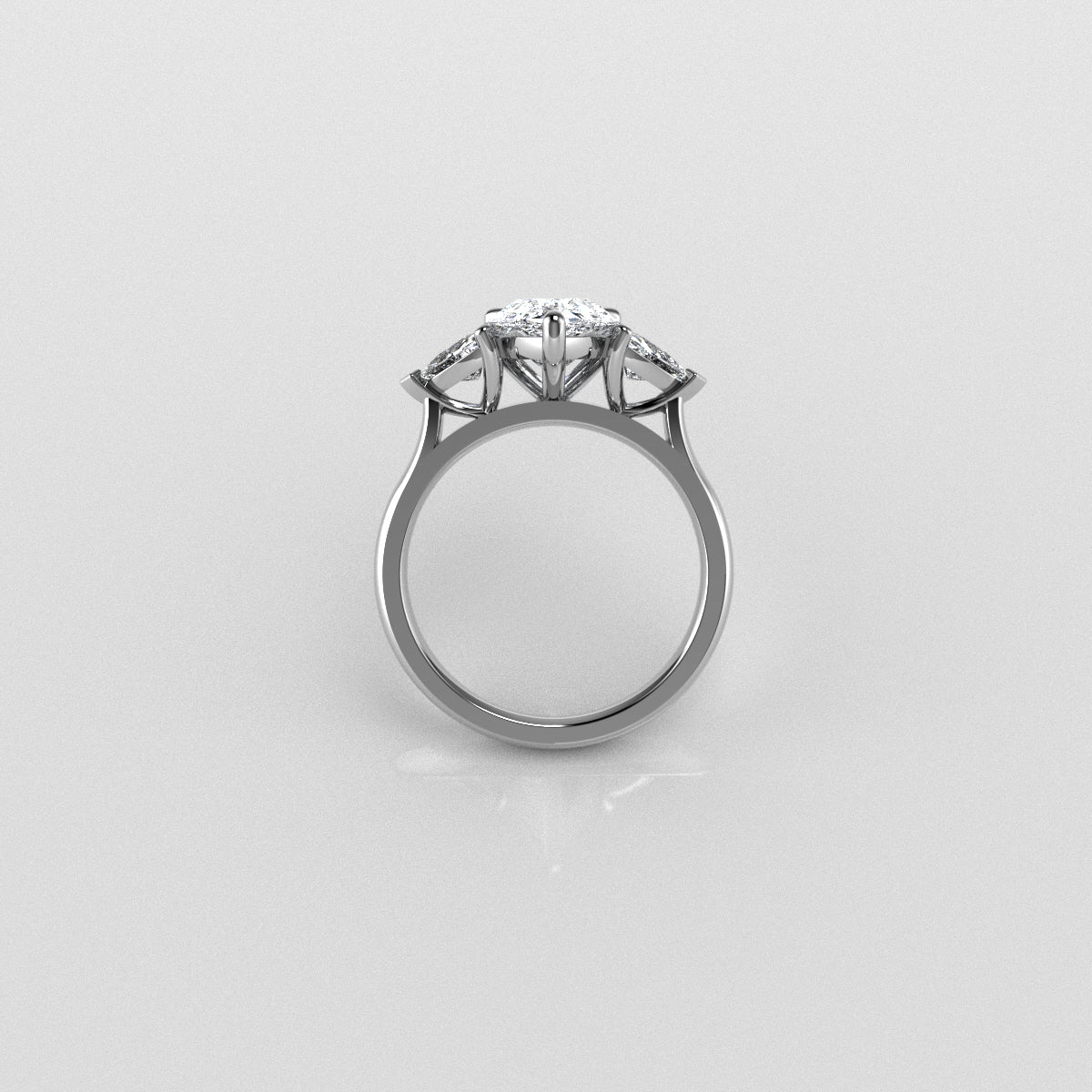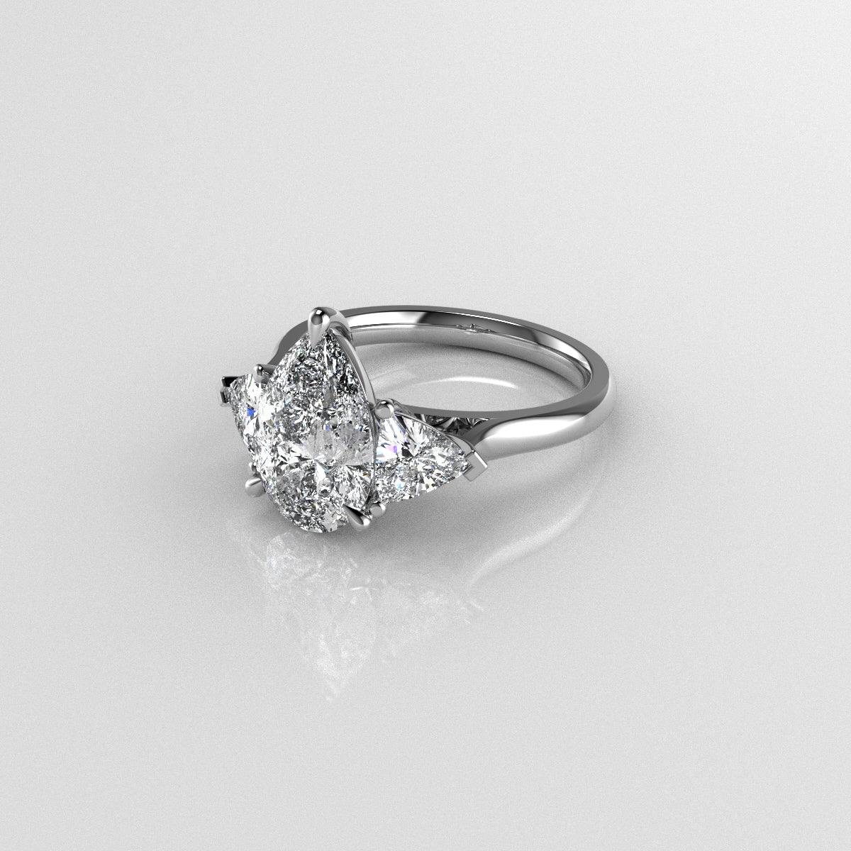 A sophisticated design that perfectly balances brilliance and symmetry. This ring features a stunning pear-cut centre diamond, gracefully flanked by two matching trillion-cut side stones that enhance the centre’s sparkle and shape.