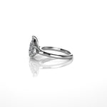 Pear shaped centre with trillion side diamonds ring with a star-shaped prong setting on a white background