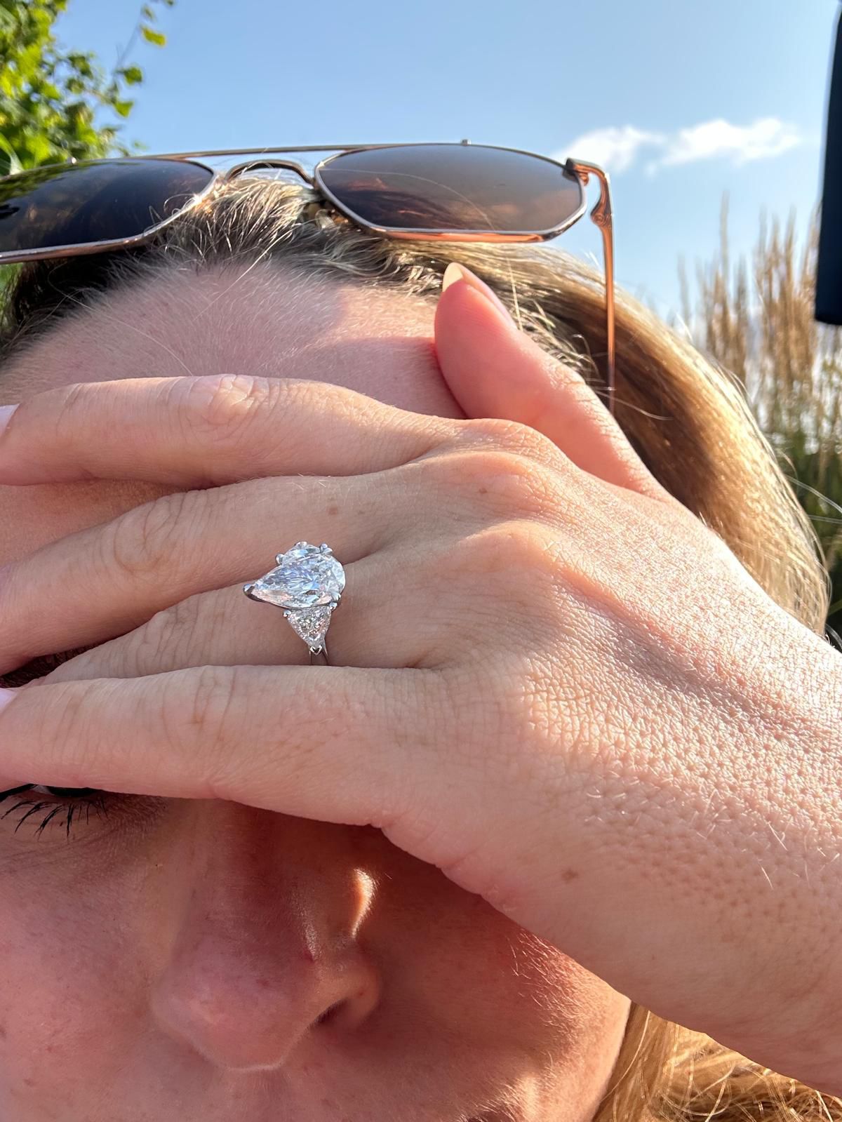 Close-up of a person wearing sunglasses with a large pear cut 3 stone diamond ring on their finger