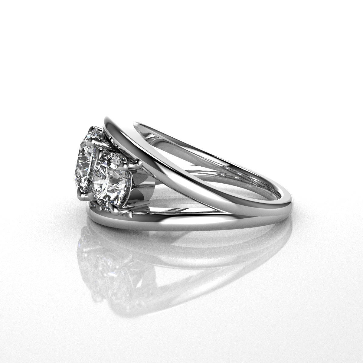 three stone round brilliant cut diamond ring on a reflective surface with a white background