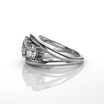 Platinum ring with three round brilliant cut diamonds in prong setting with double bar style ring on a reflective surface