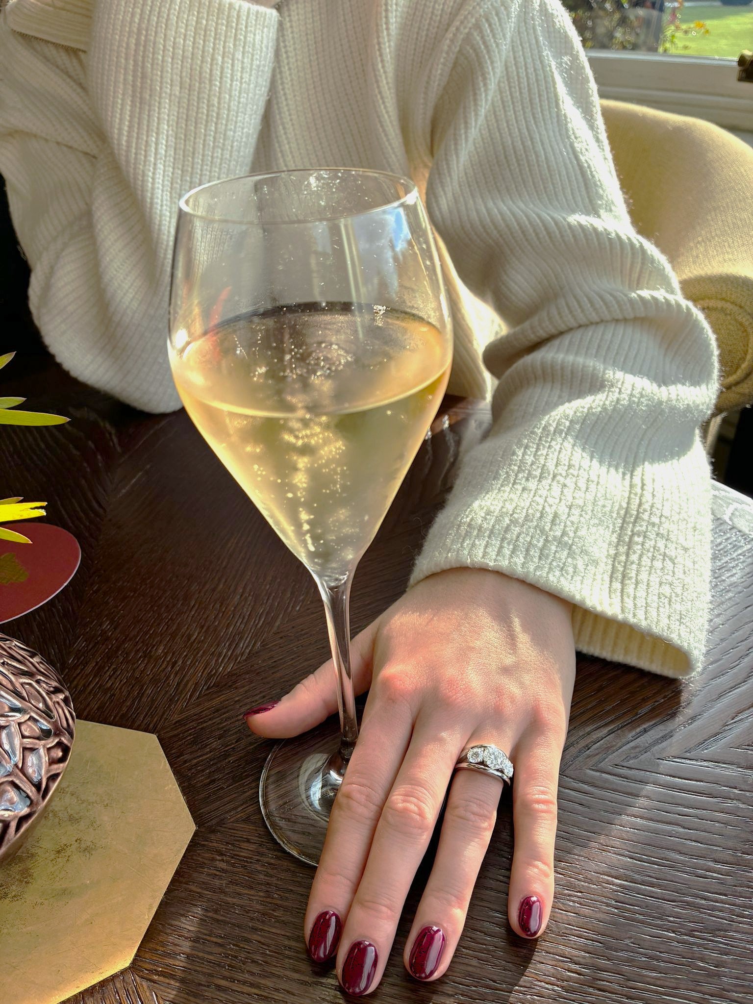Person holding a glass of white wine with a 3 stone diamond ring on a wooden table